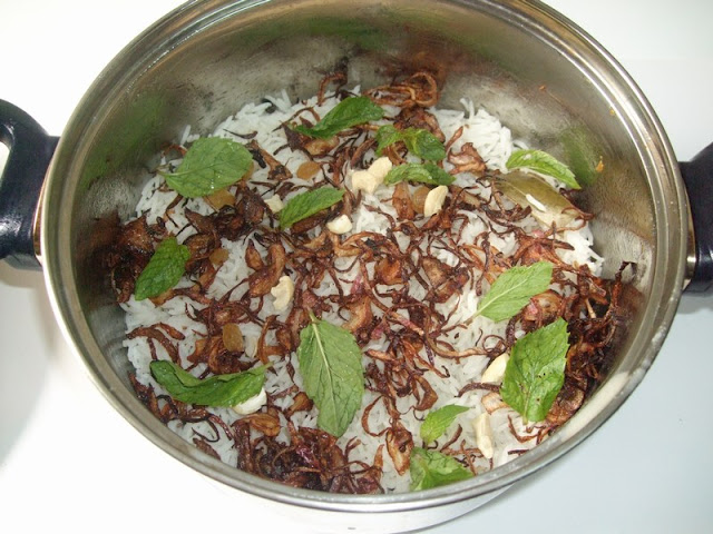वरुन परत भाताचा थर लावुन तळलेला कांदा, काजु, मनुका, पुदिन्याचे पाने लावावी.