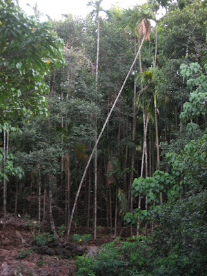 आसूद गावाविषयी लिहावं तितकंच थोडं आहे. पेंडसे इथेच राहायचे . बापूची गारंबी हीच. बापूने घेतलेल्या पोफळीच्या बागा दिसतात. राधाबाई भजी तळत बसलेली असे ते ठिकाण बघायला मिळतं. विठोबाला ज्या पुलावरून ढकलून दिला तो पूलही तिथेच आहे. गाव बघितलं की अक्षरश: प्रेमात पडायला होतं. या गावात कादंबरी घडलीच पाहिजे असं वाटतं. एव्हाना मी कोकणाच्या हिरव्या गारव्याला सरावलो होतो. पण आसूद गावात दाबके वाडीत शिरलो आणि इथे माणसं राहातात यावर विश्वासच बसला नाही. आत्तापर्यंत मला इतकी वनराई केवळ ट्रेकला जाताना किंवा नॅशनल पार्क्समध्ये वगैरे जपून ठेवलेली दिसली आहे. हिरव्याकंच झाडांमधून मध्येच घरं उगवलेली, डोंगराच्या चढउताराबरोबर त्याला बिलगून बसलेली. दुर्दैवाने माझ्याकडचा कॅमेरा अतिशयच साधासुधा होता त्यामुळे ती हिरवाई पुरेशा परिणामकारकपणे पकडता आली नाही. पण ही 'गगनचुंबी' झाडं दिसली...त्यांमागच्या गर्द वनराजीने एकंदरीत गावाची कल्पना येते.