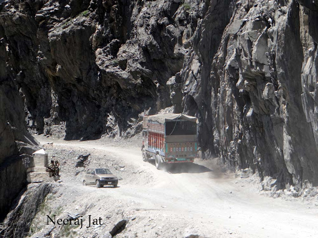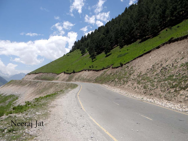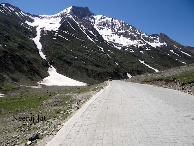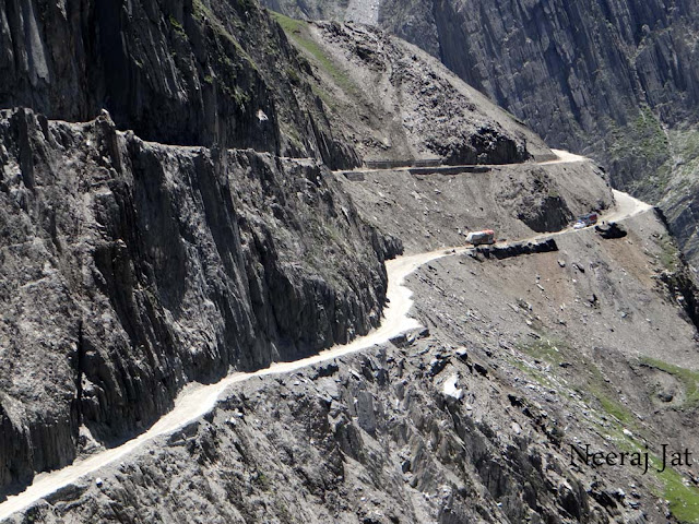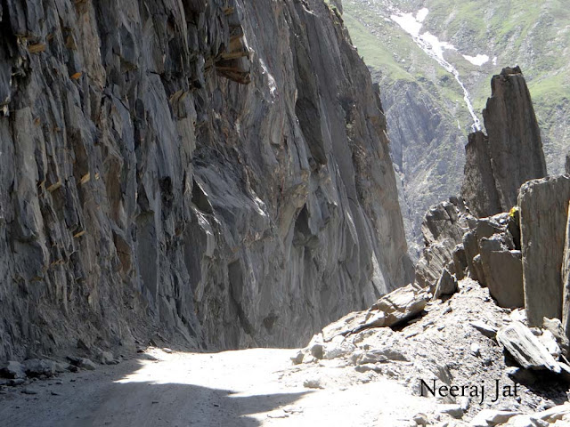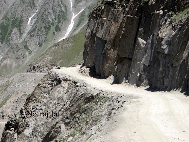इथून पुढे गेल्यावर असा नजारा पाहायला मिळाला कि, मी कल्पनाच नाही करू शकत. समोर एक मोठा पर्वत दिसला आणि एक छोटा रस्ता पण. त्याच्या बरोबर खाली बालटाल दिसलं. इथे रस्ता नव्हताच बस फक्त डोंगराचे दगड कापून असा तसा रस्ता बनवला आहे. कशी तरी गाडी जाइल एवढाच. हा रस्ता १९४७ मध्ये बनवला होता जेव्हा पाकिस्ताननि लद्दाख वर आक्रमण केले होते. नाहीतर पहिले इथे पायवाट होती. पण असा वाटत कि आताच दगड कापून रस्ता बनवलाय. ह्या रस्त्यावरून जेवढे वरती चढायचे अवघड आहे तेवढेच उतरायचे. मनाली पासूनच्या आतापर्यंतच्या प्रवासातला हा खतरनाक रस्ता होता.