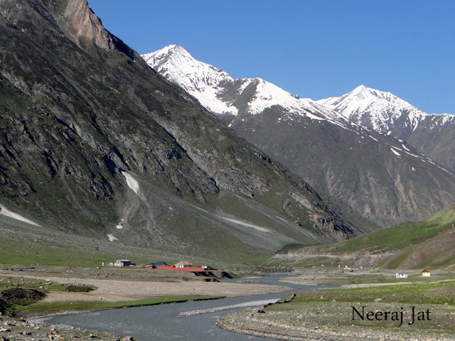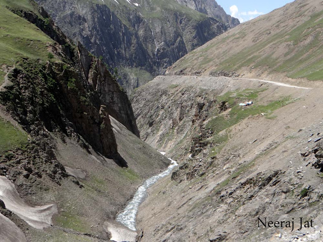 इथेच जवळ पास बर्फ होता तिथेच पर्यटक खेळत होते. नीट बघितले तर तोच बर्फ वितळून त्याचा द्रास ओढा बनतो आणि त्यात काही हिस्सा हा सोनमर्ग वरून येणाऱ्या सिंधू नदीचा. दोन्ही नद्यांचा उगम हाच आहे. अजून एक गोष्ट कि जोजीला पार केला तरी चढाई हि राहतेच. माझ्या जीपीएस नुसार जोजीला ची ऊंचाई ३४३६ मीटर आहे आणि पुढे चढाला ३५१० मीटर दाखवते.