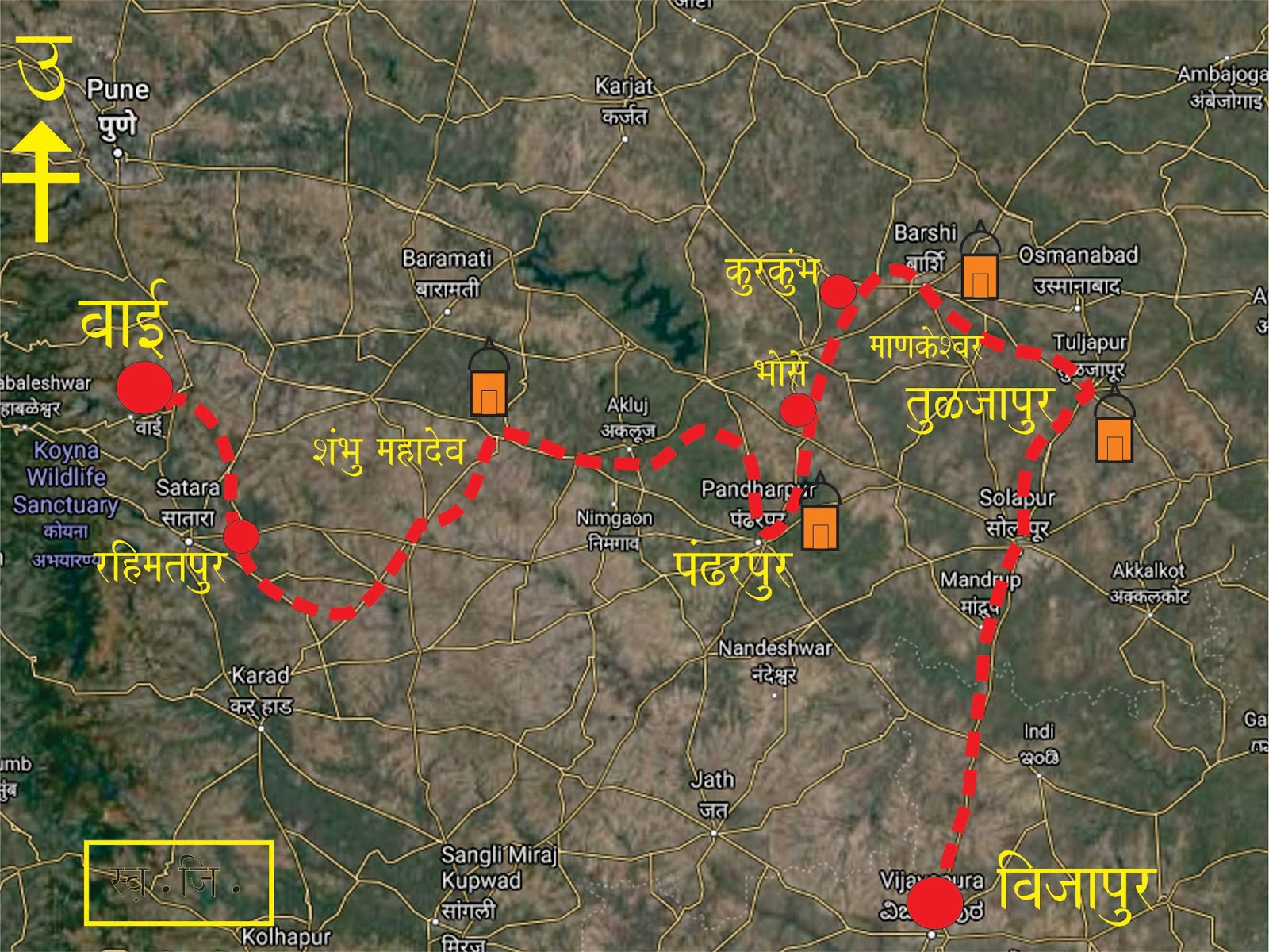 अफझलखानाचा मोहीम मार्ग विजापूर -तोरवे-डोन-माणकेश्वर-करकंव-भोस-शंभू महादेव-मलवडी-रहिमतपूर-वाई.