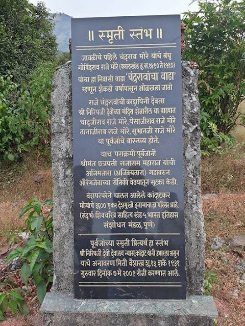 तुम्ही दिलेल्या घाटवाटांपैकी बर्याच घाटवाटांचा ट्रेक मी केलेला आहे त्यामुळे भौगोलीक स्थानमहात्म्य आणी दुर्गमता अनुभवलेली आहे. किल्ल्यांच्या यादीतील बरेचसे किल्ले देखील बघीतलेले आहेतच. कुंभरोशी जवळाच्या जावळी गावातील मोर्यांचा वाडा, शिवथर घळीजवळील चेरावडी गावाजवळचाचा मोर्यांचा वाडा आणी ऐन जावळी गाभ्यातला उचाटचा निरपजी मंदीराजवळचा मोर्यांचा वाडा हे तिनही जागा मी बघीतलेल्या असल्याने जावळी काय चीज असू शकेल याचा अंदाज नक्कीच आहे. तुम्ही जो वरती फोटोत स्मृतीस्तंभ दिलाय तो निरपजी देवराई देवळाजवळचाच ..
