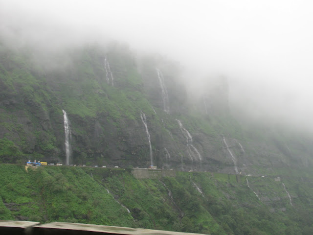 डावीकडे उंच कडे, उजवीकडे खोल दरी व मध्ये घाटरस्स्त्यावर धबधबे असे विलक्षण दृश्य होते. मधूच सह्याद्री आपला धुक्याच्या पडदा बाजूला करत होता.