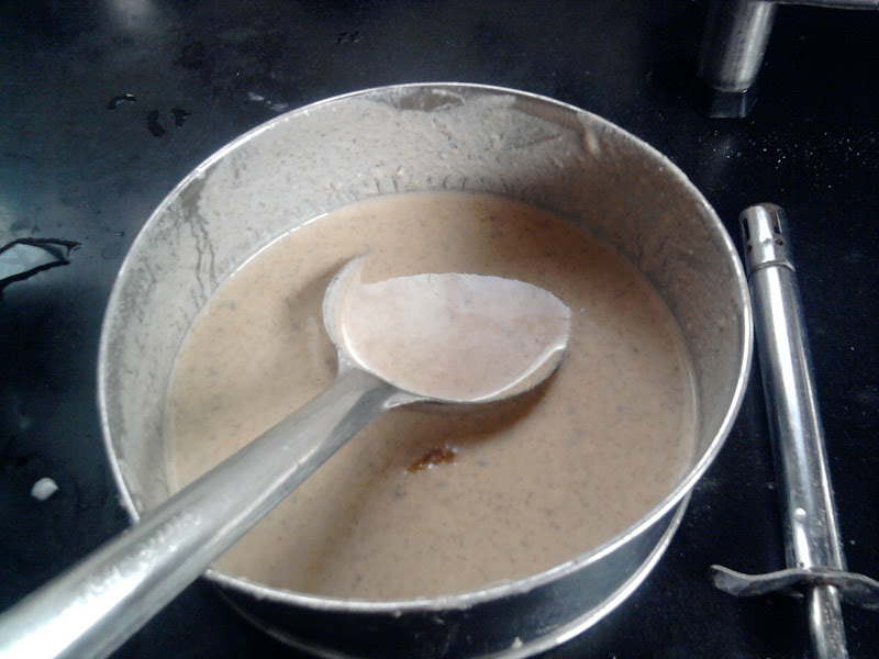 २) पीठ पातळ भिजवा आणि पॅनवर ओतून पॅन अशा तर्हेने फिरवा की ते पॅनभर पसरेल.