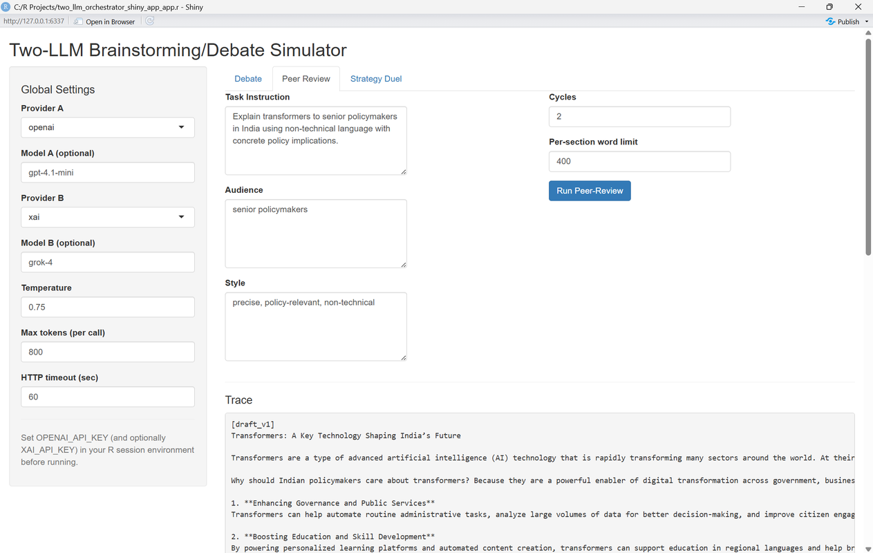 ही कल्पना मी ए०आय०च्याच मदतीने तात्काळ प्रत्यक्षात उतरवली. ओपन-एआय आणि ग्रोक या दोन ए०आय०ना अनुक्रमे चेताशास्त्रज्ञ आणि पत्रकार या भूमिका दिल्या. मग चर्चेसाठी, "कल्पकता (इनोव्हेशन) संस्कृती रुजविण्यामधली आह्वाने". मला साधारण २-३ मि०मध्ये पुढील चर्चा करून मिळाली.