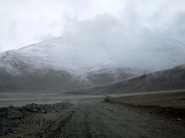 अश्या बर्फवृष्टीत जाऊ कि नको हाच प्रश्न पडला होता. नंतर विचार केला कि नकोच जायला. पुढे ८ किमी वरती डेबरिंग आहे तिथे थांबूया आणि तंगलंग-ला उद्या पार करूया. तो पर्यंत बर्फवृष्टी पण थांबेल. बर्फवृष्टीत बाहेर पडणं बरोबर नाही. मग तिथेच थांबलो. चहा घेतला.