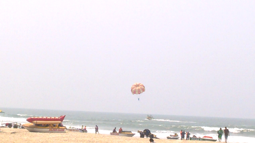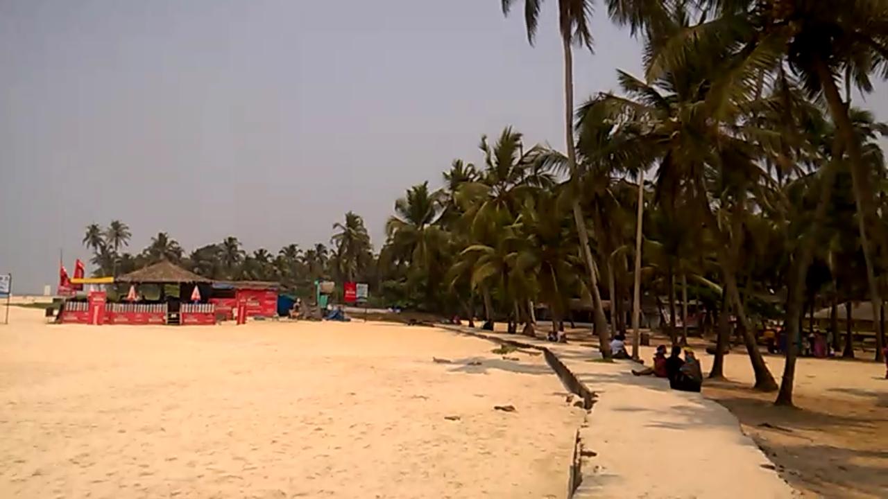 रुमवर तयार होऊन बाहेर पडायला साडेदहा वाजले. जवळच्याच कामत हॅाटेलात भरपूर नाश्ता करून तिथे बाहेरच कोलवा बीचला जाणारी बस मिळते म्हणून उभे राहिलो. समोरच्या बागेतून पलीकडे जाणारी वाट आहे तिथे काजूफळे ( मुरटे/बोंडे) १०रु/४ मिळाली. मोठमोठे चिकू पन्नासला चार होते. हे घेऊन कोलवा बसमध्ये बसलो. (( कदंबा स्टँडसमोरच्या सरळ रस्त्याने कोलवा ५ किमि आहे.) इकडून जाणाय्रा बसेस बेनोलिमला वळसा घालून कोलवा बीचला जातात. ( १५रु/-) अगोंडा/वरका किंवा पालोलें बीचलाही जाणाय्रा बसेस भराभर सुटत होत्या. टोपी,टीशर्ट,हाफचड्डी,पायात चपला,खांद्यावर शबनम पिशवी घेतलेले फारनर याच बसमधून जात होते. रेल्वेवरच्या एका यु आकाराच्या ब्रिजवरून पलिकडे जाऊन वीसेक मिनिटांत बस कोलवा बीचला पोहोचली. रस्त्याने दोन्ही बाजूस रंगीत टुमदार विला,भरपूर झाडे असं छान दृष्य दिसते. समोर अफाट पसरलेला शुभ्र वाळूचा किनारा, दोनतीन फुट उंचीच्या लाटा. काहीजण पोहताहेत. मार्च महिन्याचे दुपारचे बाराचे ऊन. वॅाटर स्कुटर, पॅरासेलिंगसाठी , पोहण्यासाठी वेगवेगळे भाग करून ठेवलेले. कडेला झावळ्यांनी शाकारलेली रेस्टारंटे. सावलीकरता नारळाची भरपूर झाडे. मजा वाटली. दोनला परत येऊन आराम केला.