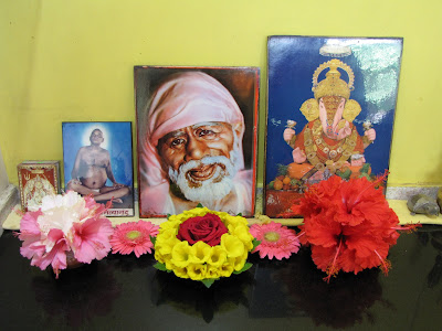 ..समोर साईबाबांच्या प्रतिमेच्या पुढ्यातही वेगळी पुष्परचना मांडलेली होती. भराभर फोटो काढले.