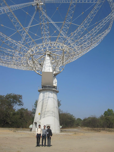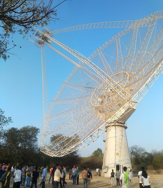 CCS च्या शिस्तबद्ध पद्धतीनुसार जीएमआरटीला जाण्यासाठी सर्व व्यवस्था केलेली होती. GMRT ला भेट म्हणजे निश्चितच अनेकांसाठी स्वप्न प्रत्यक्षात येणं होतं. संमेलनात माझे दोन मित्र सहभागी असल्यामुळे त्यांच्यासोबत हा सर्व आनंद घेता आला. GMRT वस्तुत: अतिशय वेगळं काम करणारी संस्था. पण त्यांनीही इतक्या मोठ्या ग्रूपचं आनंदाने स्वागत केलं. तिथे पोहचल्यावर आदरणीय भारतीय खगोल भौतिकीचे पितामह डॉ. गोविंद स्वरूप सरांची आठवण झाली. युरोपियन स्पेस एजन्सीच्या मंगळ मिशन मोहीमेमध्ये जीएमआरटीने कसा त्यांच्या यशाचा रेडिओ पुरावा दिला, अशा व इतर बातम्या दिसल्या. आणि अर्थातच बाउंसर असलेल्या इतरही अनेक गोष्टी दिसल्या. परंतु ह्या तांत्रिक गोष्टी GMRT च्या हिरव्यागार परिसरामुळे जड वाटत नव्हत्या. सोळंकी सरांनी परत एकदा इथले नियम सांगितले, रूपरेषा सांगितली. आणि सी- ३ डिशच्या जवळ सगळ्या खगोलप्रेमींचा मेळा भरला! डिशची भव्यता नजरेत मावत नव्हती. एका अतिशय वेगळ्या ठिकाणी आल्याची जाणीव सतत होत होती. GMRT चे तांत्रिक पैलू, डिशची रचना, कार्य, तंत्रज्ञान ह्याबद्दल तिथल्या वैज्ञानिकांनी माहिती दिली. हवे तितके प्रश्न विचारू देण्याचा त्यांचा संयम कौतुकास्पद वाटला. दुपारच्या सत्रात GMRT च्या इतर पैलूंबद्दल तिथल्या अभियंत्यांनी व वैज्ञानिकांनी माहिती दिली. आता अपग्रेड झालेली GMRT किती मोठं योगदान देते आहे, हे सांगितलं. खगोलप्रेमींच्या शंकांचं समाधान केलं. तांत्रिक पैलू शक्य तितके सोपे करून सांगितले. फिजिक्सच्या विद्यार्थ्यांनी त्यांना खूप चांगले प्रश्न विचारले.