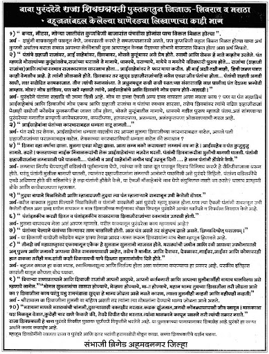 पण ज्या पद्धतीने बाबासाहेब पुरण्दरे यान्नी हिन्दु मुस्लिम द्वेश निर्माण होइल, स्वराज्य स्थापणेच्या प्रेरणे मागे ब्राह्मणच होते असा खोटा इतिहास सादर केला त्याला तुम्ही विरोध कर्णार की नाही ?? हा शोध तुम्ही कुठुन लावला ? काही संदर्भ /पुरावा देउ शकाल का? बाबासाहेब पुरंदर्‍यांनी जो इतिहास लिहिला आहे तो त्यांनी सप्रमाण लिहिला आहे . अनेक माहित असलेल्या कथा पण ज्यांना पुरावे देता येणार नाही त्या त्यांनी त्यांच्या शिवचरित्रात सांगीतलेल्या नाहीत. कुठेही उगीच वायफळांचा मळा पिकवला नाहीये . त्यांनी शिवाजीची डोळस भक्ती केली आहे. त्यांनी स्वतः अनेक वेळा सांगीतले आहे की ते शिवाजीला देव मानत नाहीत पण अनेक संशोधनांनंतरही त्यांच्या चारित्र्यात कुठेही खोट अढळत नाही. ज्यांना कुणाला काही माहित असेल त्यांनी पुराव्यानिशी सांगावे मग ते मान्य करतील ... पण आज पर्यंत असे कोणीही केले नाही. बाबासाहेबांनी कधीच कुठल्याही धर्माच्या/जातीच्या बाजूने अथवा विरुद्ध विधाने केलेली नाहीत त्यामुळे असे विधान करणे चुकीचे आहे .