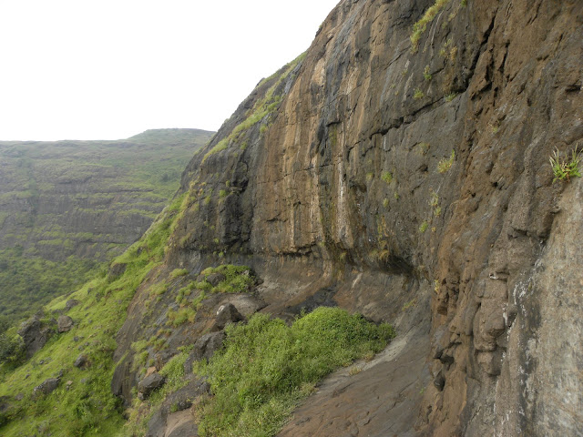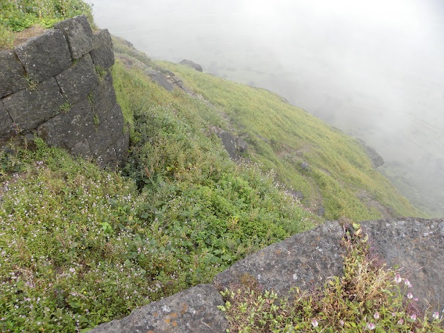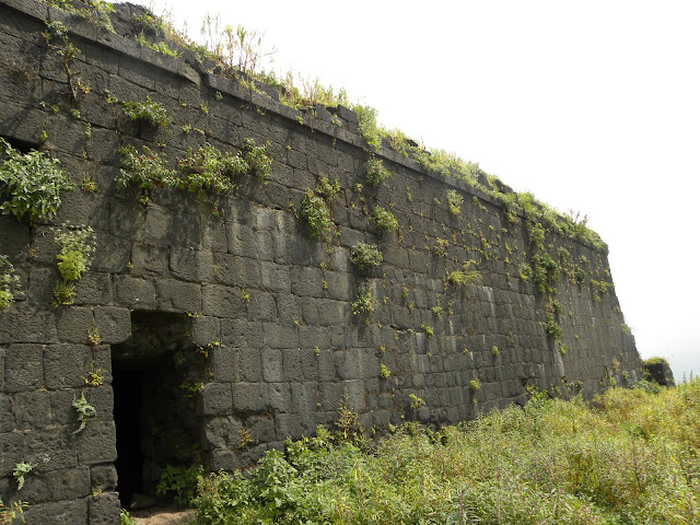 आता मोठे मोठे ढग किल्ल्याच्या मागच्या बाजूला धडका देत होते. किल्ल्याच्या मागची बाजू म्हणजे एक तुटलेली अख्खी धारच आहे. थेट पलीकडच्या कोकणवाडीला हा सरळ तुटलेला लांबचलांब कडा भिडतो. तसेच कडेकडेने थोडे पुढे गेलो. तटबंदी होतीच. अशातच पुर्णपणे ढासळलेला व प्रचंड गवतामुळे वाट बंद झालेला एक भग्न दरवाजा सामोरा आला. आताशी वाट मात्र तो दरवाजा टाळून थोडी पुढे काढली आहे. ही वाट पलीकडे असलेल्या कोकणवाडीत उतरते.