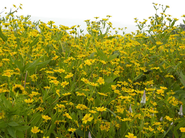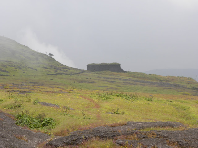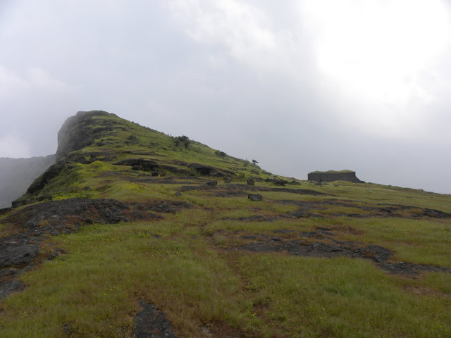 अजून थोडे वर चढून आम्ही वरच्या पठारावर आलो. व किल्ल्याचे एक आतापर्यंत न दिसणारे नवीनच रूप डोळ्यांसमोर आले. अगदी प्रचंड मोठे लांबचलांब पठार 'पट्टा' नावाची सार्थकता पटवून देत होते. अगदी दूरवर किल्ल्याच्या तटबंदीचे बांधकामही दिसत होते. सर्वत्र हिरवाई पसरली होती. मध्ये मध्ये सोनकीचे ताटवेच्या ताटवे होते.