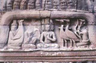 वाल्मीकिकडून रामायण कसे रचले गेले ह्याची कथा ह्या शिल्पामध्ये - जे ब्रान्तेइ ख्मार नावाच्या दुसर्या एका देवळामध्ये आहे - दाखविली आहे. जगामध्ये पूर्णपुरुष कोणी आहे काय असे एकदा वाल्मीकिने नारदास विचारले. अयोध्येचा राजा राम हा असा पुरुष आहे असे नारदाने उत्तर दिले. तदनंतर काही दिवसांनी तमसा नदीमध्ये स्नान करण्यासागी वाल्मीकि जात असता एका रतिमग्न क्रौंच पक्षियुग्माची पारध करणारा निषाद त्याला दिसला आणि त्याच्या मुखातून उत्स्फूर्तपणे श्लोक बाहेर पडला: