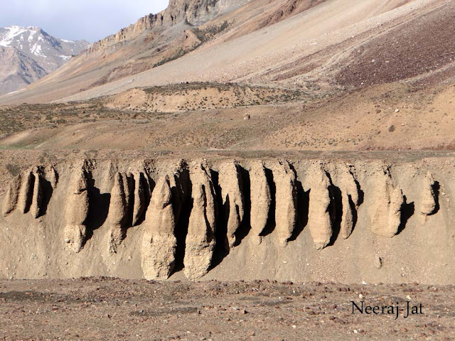 जवळ जवळ १५ किलोमीटर सरचू पर्यंत असंच होतं. बराबरीन एक नदी वाहत होती. किनाऱ्याला साचलेल्या माती मुळे ती अजूनच खोल वाटत होती. तिचे दोन्ही किनारे मातीमुळे उभे राहिले होते. त्याच्या वरची वेग वेगळ्या आकृत्या तयार झाल्या होत्या. खूपच वेगळ्या वाटत होत्या.
