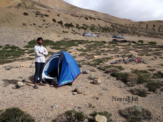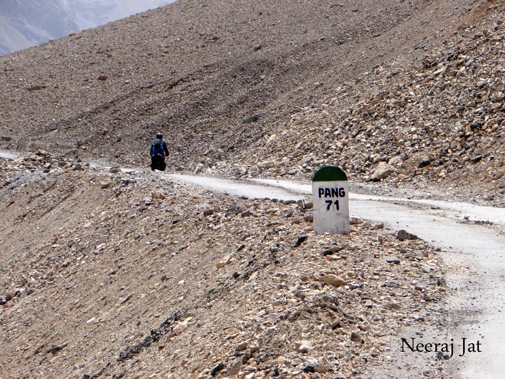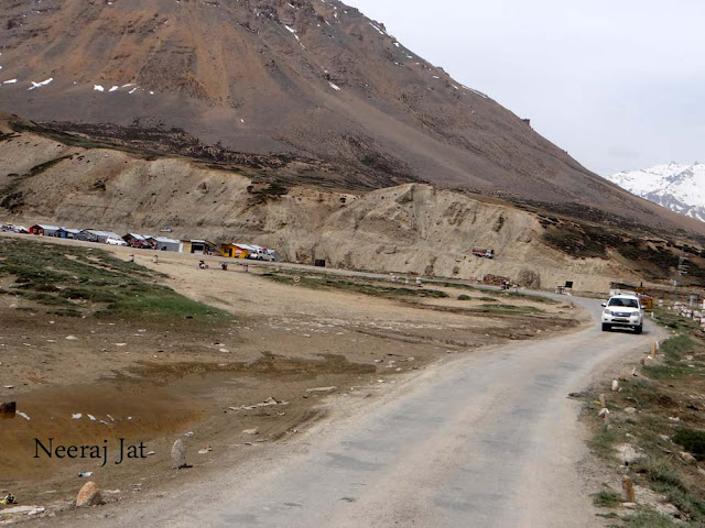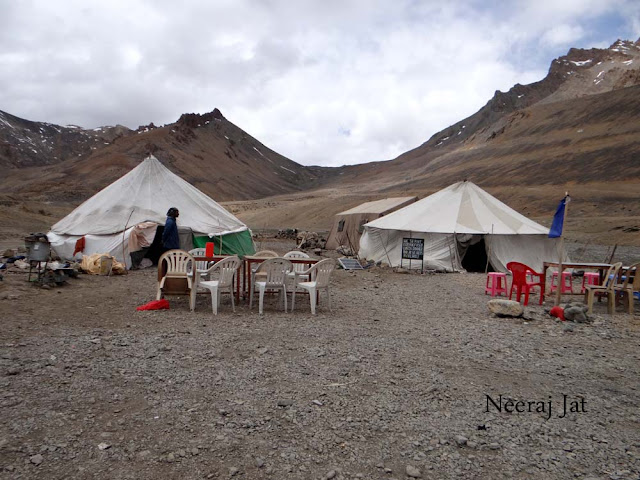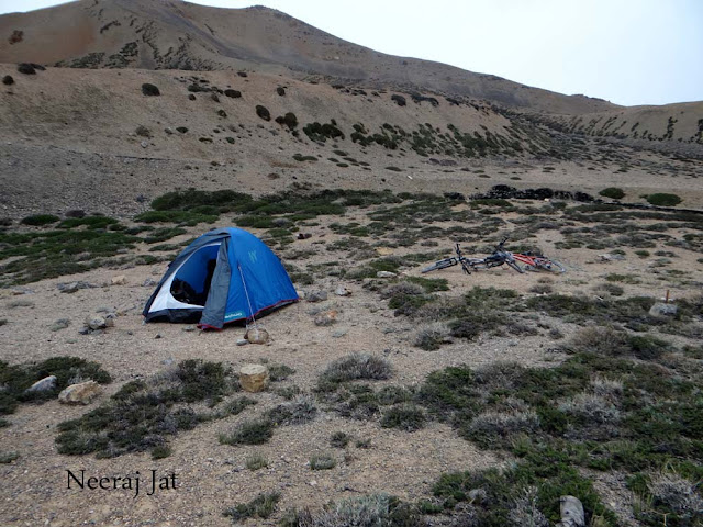 नकी-ला नंतर रस्ता खराब होत जातो. वरून पावसाचे थेंब पण पडत होते. अश्या हवामानात साडे चार किलोमीटर खालच्या तंबू पर्यंत सायकल चालवावी लागली. सचिन तिथेच भेटला. तंबू चा मालक लद्दाखी होता. त्याचे नाव सेरिंग सेन्दुप. त्याने एका छोट्या तंबू मध्ये सायकल लावली. त्यामुळे सामान भिजल्या पासून वाचले. मी इथे पावणे एक ला पोहोचलो होतो. अर्ध्या तासानंतर पाउस पडायचा थांबेल असे वाटले होते. सचिन ने तर ठरवलं होत कि हवामान कसे हि असू, इथून दोन वाजता निघणार म्हणजे निघणार. पण मी तयार नव्हतो. याचं कारण इथून पुढे ६ किमी वरती लाचुलुंग-ला आहे. ज्याची उंची ५०६० मीटर उंच आहे. नकी-ला पार करायलाच जीव गेला आणि आता अजून पुढे वरती चढायचे आहे. नको रे बाबा !! आणि दुसरं कारण म्हणजे हवामान. पाउस पडायचा भले हि थांबला असेल पण आकाशात काळ्या ढगांनी गर्दी केली होती. त्यातच जोराचा थंड वारा वाहत होता. परत कधी पण पाउस पडायची शक्यता होती. आणि ५००० मीटर उंचीवर भिजायचे परिणाम मला चांगले ठाऊक आहेत. मी बरोबर कधी हि औषधे ठेवत नाही. मग मी मुद्दामून असं काम का करू कि, मला औषधे घ्यावी लागतील. म्हणून मी आज इथेच थांबणार!! उद्या पांग ला जाणार. आज फक्त ११ किलोमिटरच सायकल चालवली. पण त्याचे काही मला दुख नव्हते.