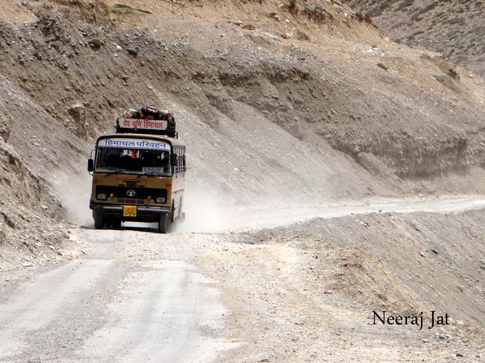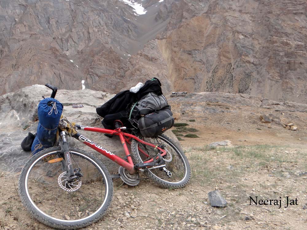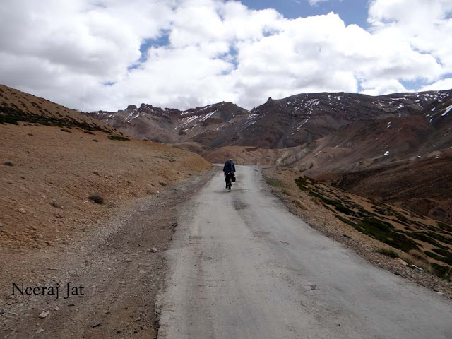 सायकल पुढे चालवता येईना म्हणून खाली उतरून पायाने चालू लागलो. पैन्दल मारण्यापेक्षा सायकल ढकलीत चालण्यातच मजा वाटत होती. काल रात्री पाउस झाला तेव्हा वाटले कि, असं होत असेल कारण हिमालयात दुपारी ३ नंतर हवामान खराब होतं. त्यामुळेच पाउस पडला असेल. पण सकाळी असच हवामान बघितलं,तेव्हा मनात शंखेची पाल चूक चुकली. हि हिमालयाच्या पुढची जमीन आहे. पण का माहित हे एवढे ढग चुकून कसे इकडे आले. आणि आता जायचे तर नावच घेत नाही. ढग नुसते जमून आले होते पण पाउस जास्त पडत नव्हता. पण जोरात थंड वाऱ्याने नाकी नऊ आणले होते. दोन दिवसापूर्वी उन्हाने त्रास दिला होतं. तेव्हा देव जवळ पार्थना केली कि उन जाऊदे. देवाने माझे ऐकले. उन गायब. मला आधीच कळाले असते कि, देवा जवळ उन्हा साठी पर्याय फक्त थंड वारा आहे. तर मी प्रार्थना केलीच नसती. ढग किती पण पाठवून दे पण जोराचा थंड वारा नको.