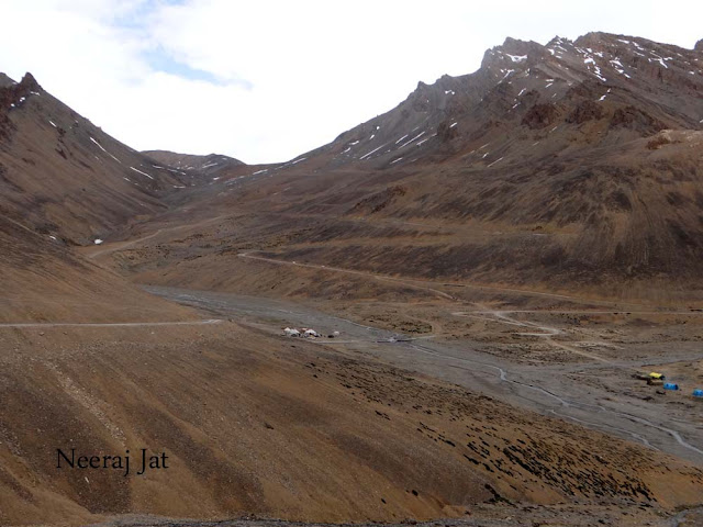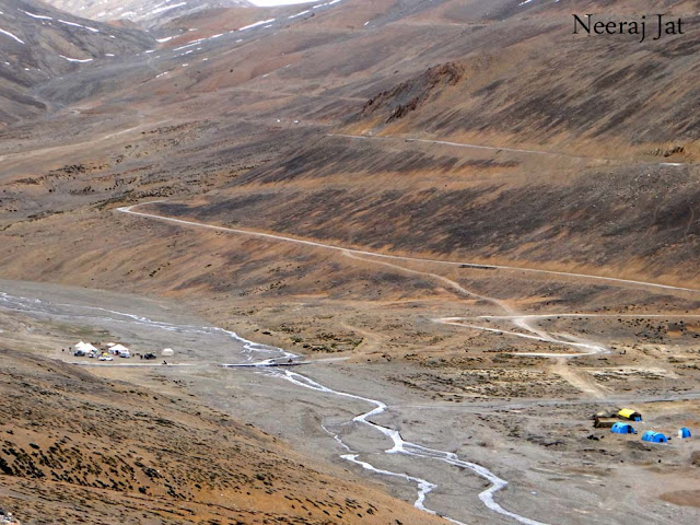 इथून व्हिस्की ओढा, त्याच्या बरोबरीने तंबू आणि जो रस्ता वरती जात आहे तिकडे लाचुलुंग-ला आहे. ५०६० मीटर वर.