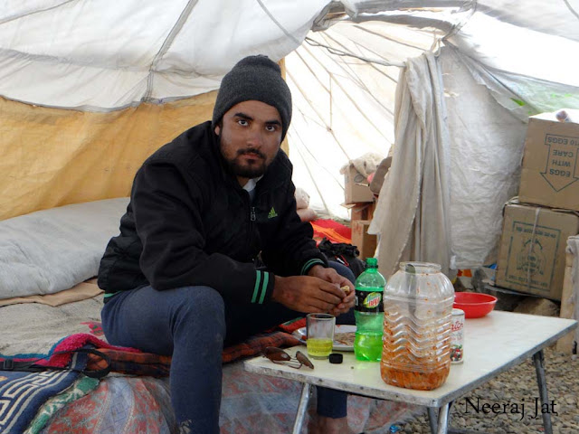 सकाळी आठ ला उठलो. बाहेर कसला तरी आवाज येत होता. दोन मोटारसायकली आणि दोन कार थांबल्या होत्या. आणि पर्यटक आमच्या तंबू पाशी येउन फोटो काढत होते. काल संकटाच्या परिस्थिती मध्ये तंबू इथे लावावा लागला होता. मागे ३४ किलोमीटर सरचू आणि पुढे ११ किलोमीटर व्हिस्की ओढा इथेच लोकांची वस्ती आहे. अश्या सुमसाम जागे मध्ये, आमचा तंबू म्हणजे एक आकर्षण केंद्र होतं. हि लोक रोहतक ची होती.