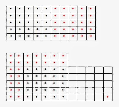 दिलेल्या चौरसाच्या दुप्पट क्षेत्रफळाचा वर्ग कसा काढायचा? दिलेला चौरस शेजारीशेजारी दोन वेळा मांडायचा आणि त्यातील दाणे खालील आकृतीत दाखविल्याप्रमाणे मांडून नवा चौरस मिळतो का हे पाहायचे. आकृतीत ५ इतकी बाजू असलेले दोन चौरस शेजारीशेजारी काढून तेच धान्याचे दाणे वेगळ्या मार्गाने मांडून नवा चौरस मिळतो काय हे पाहण्याचा प्रयत्न केला आहे. असे दिसते की ७ बाजू असलेला नवा चौरस ह्यातून निघतो पण १ दाणा शिल्लक राहतो. हा प्रयोग कोठल्याहि संख्येवर केला तरी सगळे दाणे वापरून नवा चौरस निर्माण करता येत नाही हे लवकरच ध्यानात येते. प्रत्येक वेळी काही दाणे उरतात तरी किंवा कमी पडतात. म्हणजेच केवळ पूर्णांक आणि पूर्ण विभाजन देणारे भागच केवळ वापरून दुप्पट आकाराचा चौरस निर्माण करता येत नाही हे लक्षात येते.