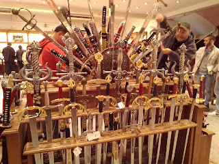 थोडे अवान्तर. स्पेनमधील टोलीडो (Toledo) हे ऐतिहासिक शहर अनेक शतके मुस्लिम मूरिश सत्तेखाली होते आणि ह्या मूरिश लोकांनी अरब देशांमधून धातुकाम, कांचकाम अशी कौशल्ये तेथे आणली होती. टोलीडो शहर तलवारी बनविण्यासाठी प्रसिद्ध होते. शिवाजीमहाराजांची ’भवानी तलवार’ ही एक Toledo Blade असावी असा एक तर्क वाचला आहे. सध्या खर्याखुर्या तलवारींना मागणी कमी आहे पण टोलीडोमध्ये टूरिस्टांसाठी देखाव्याच्या तलवारी विकण्याचा मोठा व्यवसाय आहे. मी टोलीडोला फेब्रुअरी २०१५ मध्ये भेट दिली होती. तेथील तलवारींच्या दुकानाचे मी घेतलेले चित्र पुढे दाखवीत आहे.