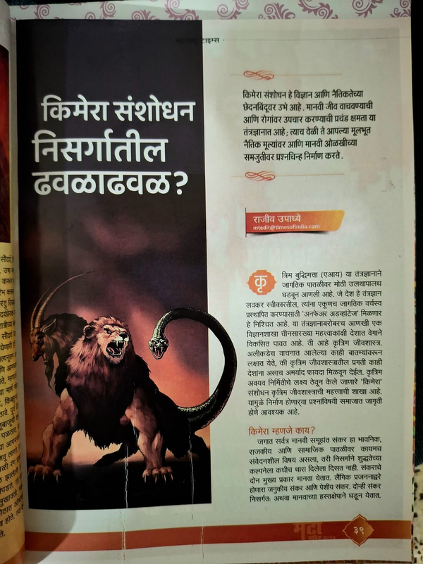 राजीव उपाध्ये यांचा "किमेरा संशोधन: निसर्गातील ढवळाढवळ?" हा लेख मिसळपाववर प्रकाशित झाला आहे. हा लेख कृत्रिम जीवशास्त्रातील किमेरा संशोधनावर प्रकाश टाकतो, जे जागतिक स्तरावर, विशेषतः चीनसारख्या राष्ट्रांमध्ये वेगाने विकसित होत आहे. किमेरा संशोधनाचा मुख्य उद्देश कृत्रिम अवयव निर्मिती आहे. वैज्ञानिकदृष्ट्या, किमेरा म्हणजे एकाच प्रजातीच्या दोन किंवा अधिक आनुवंशिकदृष्ट्या भिन्न व्यक्तींच्या पेशी एकत्र असलेला जीव. या तंत्रज्ञानाचा स्वीकार करणाऱ्या राष्ट्रांना "अनफेअर ॲडव्हाण्टेज" मिळेल, असे लेखक सुचवतात. 'किमेरा' या शब्दाला प्राचीन ग्रीक पौराणिक कथांमधील भयभीत करणाऱ्या राक्षसाशी जोडले जाते, ज्यामुळे या संशोधनाभोवती एक गूढ आणि अनैसर्गिकतेची भावना निर्माण होते.